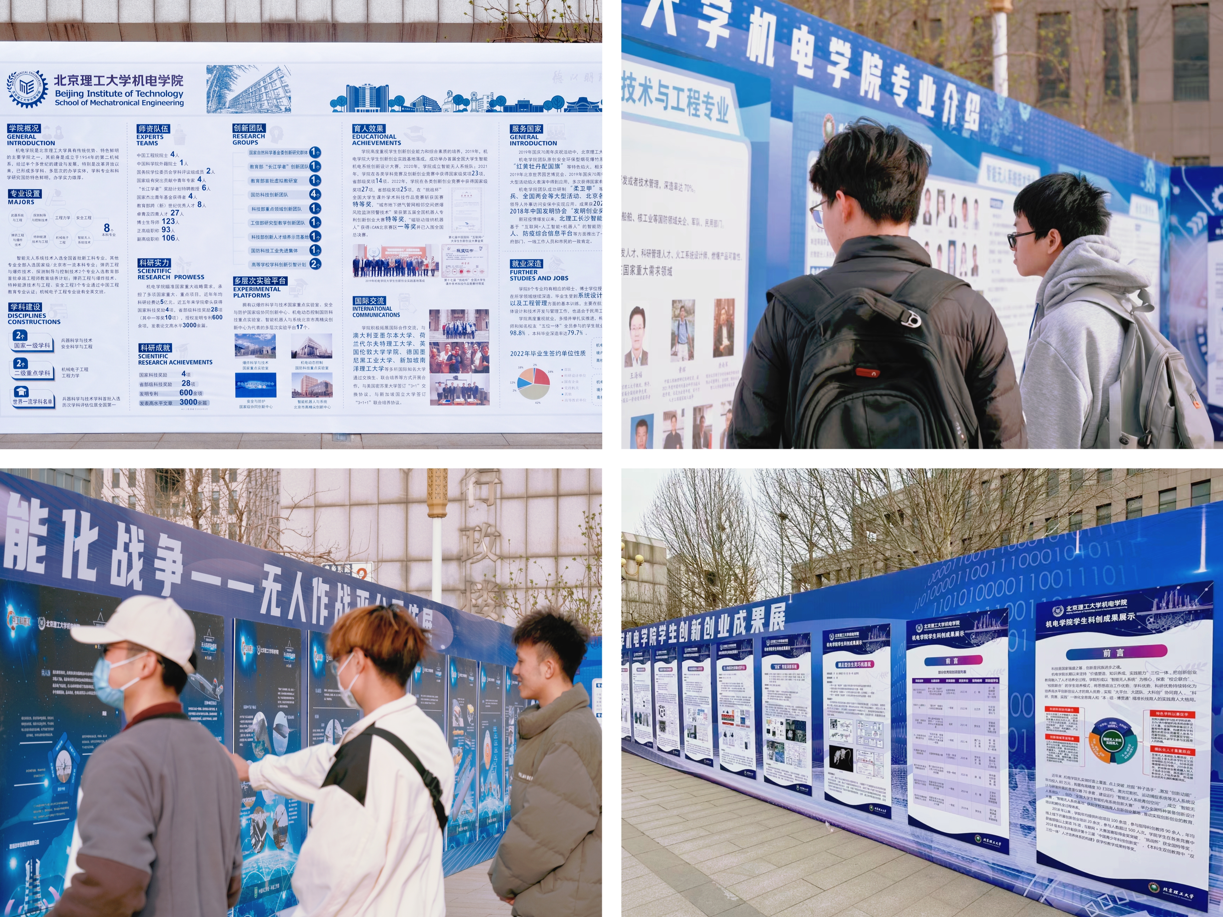 3月24日,“兵智融合”系列展览与“兵器嘉年华”活动在良乡校区行政楼前广场启动,千余名师生在活动现场驻足停留。专业介绍展览生动详尽地向本科生多维度展示了御书屋 概况、专业设置、学科建设、师资队伍、科研实力、就业方向及优秀校友。学生科创作品成果展览展示了学院的优秀成果,从仿生机器鼠到智能消防系统,从轮履腿陆地航母到预警疏散软件,图文并茂地揭开优秀科技创新作品的神秘面纱。智能化无人系统展览以知识科普的形式对地面无人平台、无人机、无人艇、无人潜航器、仿生平台等作战系统以及四大核心组成单元进行了充分介绍,展示了国家重大需求领域的重要研究方向。现场驻足的青年学子,或三五好友交流讨论,或抄写记录重要信息,在国家重大需求与科技的巧妙结合中,学生们感受到创新思维的萌发与碰撞,开启了对专业规划选择的深入思考,燃起了为国铸剑的青年豪情。