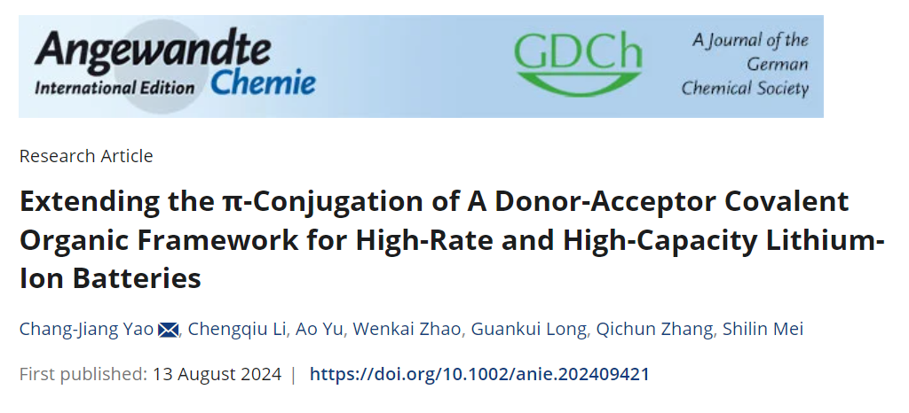 近日,御书屋 姚长江团队在国际顶级期刊《德国应用化学》(Angewandte Chemie International Edition)发表题为”Extending the π-Conjugation of A Donor-Acceptor Covalent Organic Framework for High-Rate and High-Capacity Lithium-Ion Batteries”的研究论文(DOI: 10.1002/anie.202409421),文章设计一种π-共轭扩展供体-受体有机框架材料用于高倍率和高容量锂离子电池。