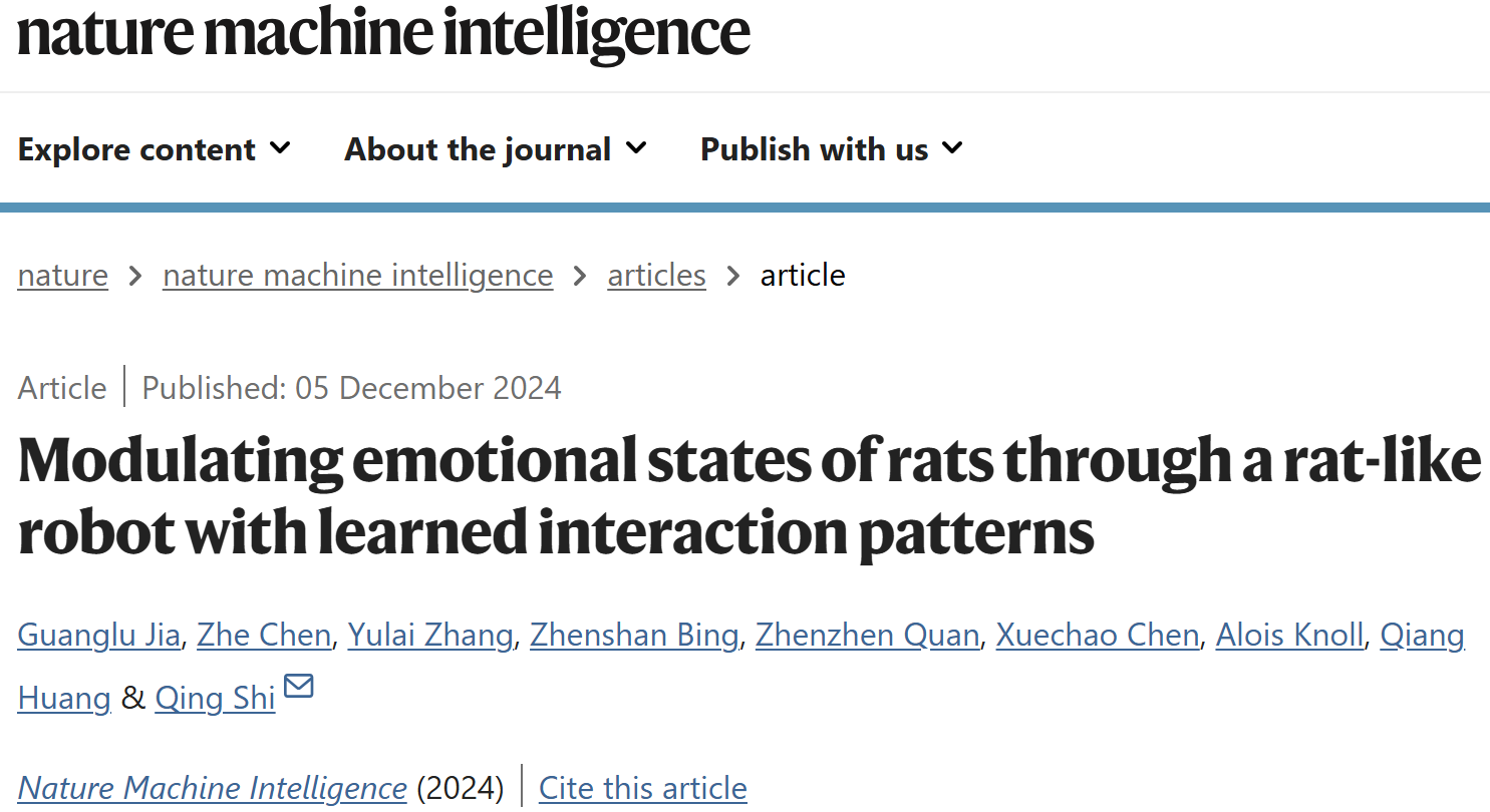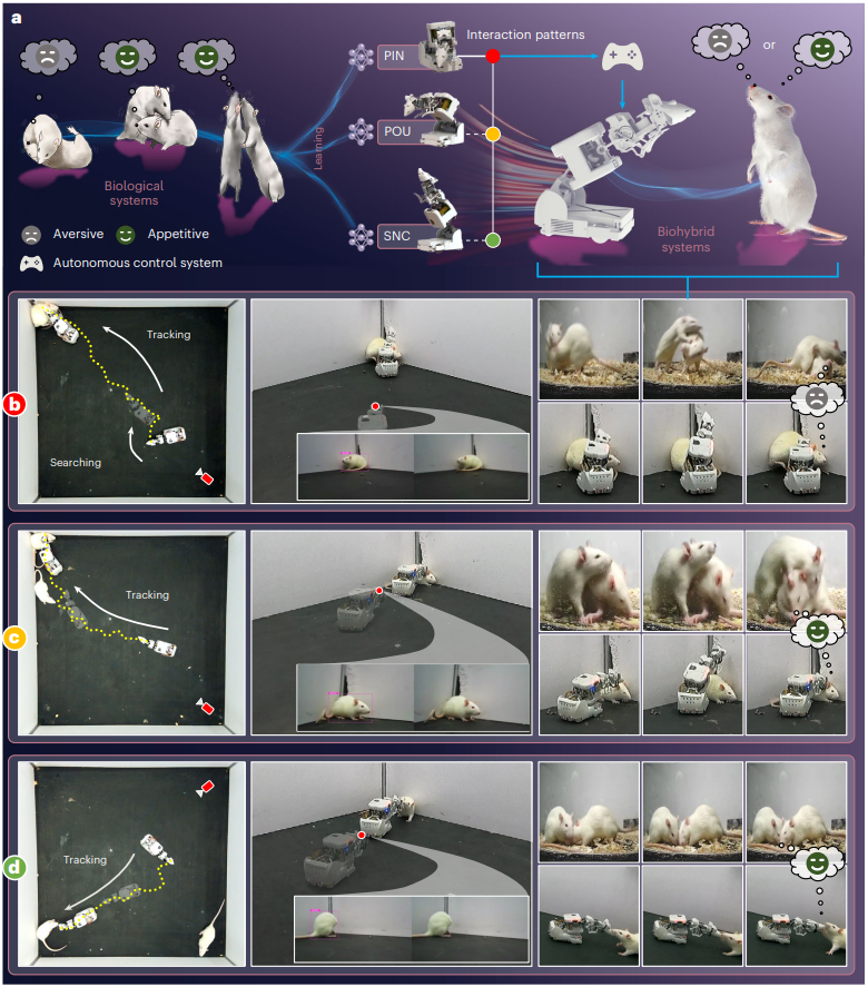 御书屋 石青教授团队在机器人-动物交互领域取得重要进展,12月5日,其研究成果“通过类鼠机器人调节大鼠情绪状态(Modulating emotional states of rats through a rat-like robot with learned interaction patterns)”为题,以长文(Article)形式在线发表于自然子刊《自然·机器智能》 (Nature Machine Intelligence)。该成果首创了一种机器人-大鼠社交范式(图1),展示了独特的社交学习技能,实现了机器人与动物长时、重复和可控的开放式互动,克服了生物系统内自然社会交互的局限性,为理解人类与人工智能之间的“社会”互动提供新思路。