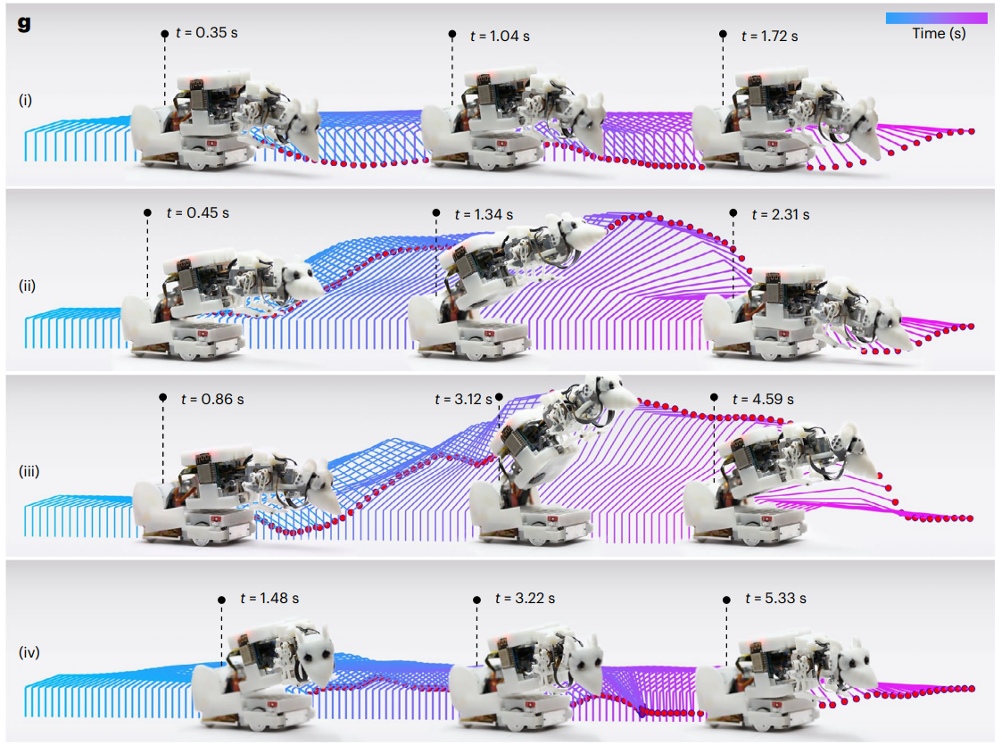 从大鼠的解剖结构、动态运动和社交互动中获得灵感,该团队开发了一款小型类鼠交互机器人。通过关键运动关节映射模型,设计了高灵活多关节脊柱,具有几乎与大鼠运动极限一致的运动空间,解决了机器人的复杂社交姿态表达难题。基于动物演示的模仿学习算法实现了四种社会行为模板生成,学习到的行为可以表现出大鼠的运动特征,具有高相对动态范围指数和高动态相似性。与国际同类机器人相比,在移动速度、体长、仿生外观、运动能力等方面更接近大鼠,综合性能更优(图2)。