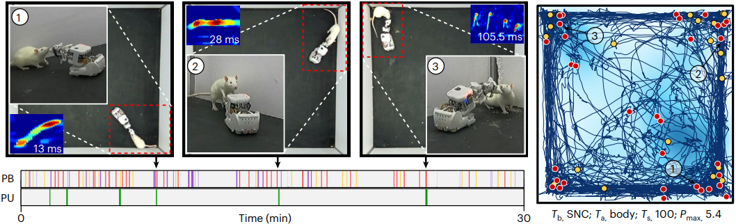 图3 与类鼠机器人社交互动实验后的大鼠表现出不同行为和声学反应